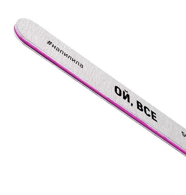 Это больше, чем просто пилка, это твой личный аксессуар! Каждая надпись как отражение индивидуальности и настроения. Но кроме креативного дизайна, это еще и верный профессиональный помощник в маникюре и педикюре. Пилка предназначена для придания формы натуральным ногтям. Две рабочие поверхности с разной жесткостью. Такая степень абразивности предусмотрена специально для того, чтобы быстро убрать длину и скорректировать форму. Заостренный кончик пилки позволит легко и аккуратно обработать труднодоступные боковые стороны ногтевой пластины без ее травмирования. Благодаря высокому качеству и прочности пилка прослужит долго, а надпись не утратит смысла.Легко моется и дезинфицируется.
