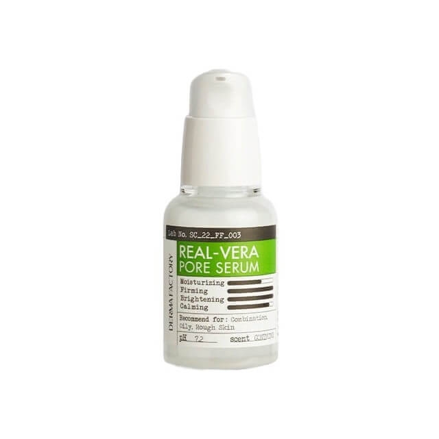 Сужающая поры сыворотка Real Vera Pore Serum от косметического бренда Derma Factory обогащена экстрактом алоэ вера и предназначена для активного ухода за лицом. Средство на 10% состоит из экстракта алоэ, обогащено ферментированным лизатом бифидобактерий, ниацинамидом, гиалуроновой кислотой нескольких типов и другими биоактивными компонентами.