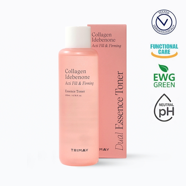 Тонер-эссенция для упругости кожи Trimay Collagen Idebenone Acti Fill&Firming Essence Toner при нанесении моментально освежает и увлажняет, придаёт эластичность, разглаживает и уплотняет кожу, поддерживает молодость. Тонер стимулирует синтез собственного коллагена и способствует образованию эластиновых волокон, повышает тургор кожи.