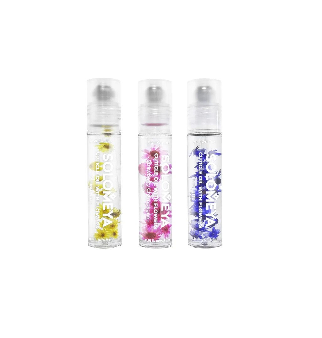 Масло для кутикулы Solomeya с роликовым аппликатором и натуральными цветами внутри моментально восстанавливает и увлажняет кутикулу, придает рукам ухоженный вид.