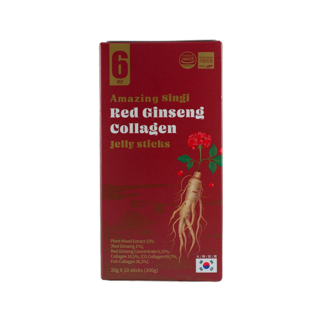 Жевательные стики желе с красным женьшенем и коллагеном SINGI Red Ginseng Collagen 3300 содержат пользу шестилетнего корейского женьшеня и высококачественного коллагена, помогая поддерживать здоровье кожи, укреплять иммунитет и восстанавливать силы.