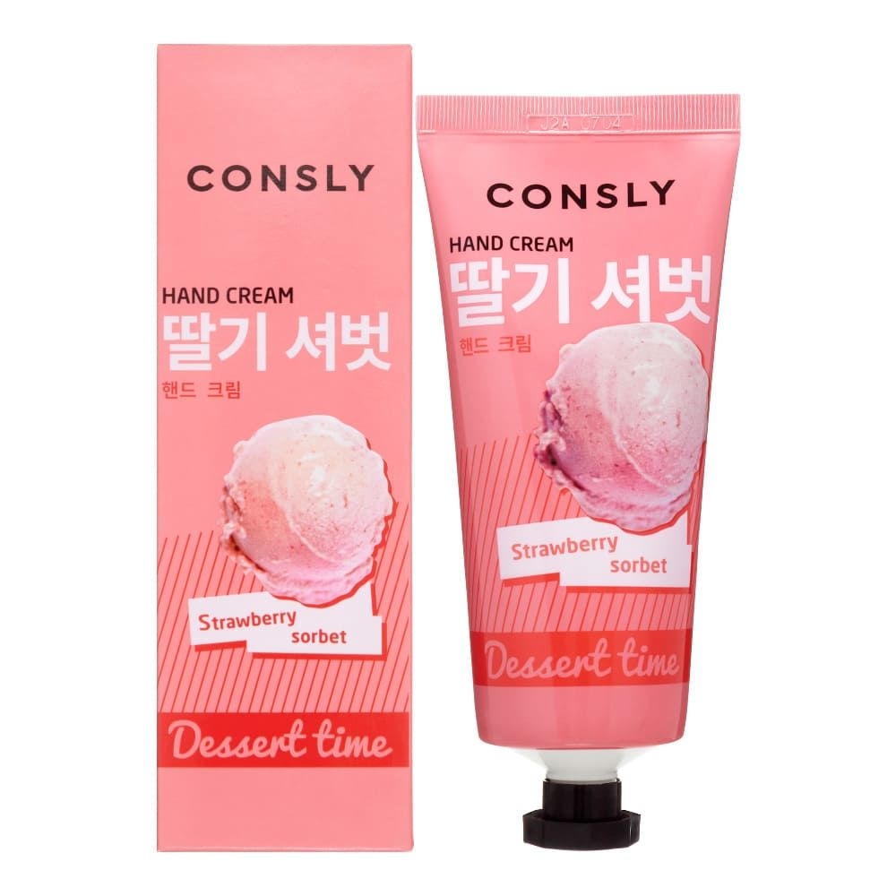 Крем для рук с ароматом клубничного сорбета Dessert Time Strawberry Sorbet Hand Cream южнокорейской марки Consly входит в коллекцию косметических средств, сочетающих в себе комплексный уход и ароматерапию. Нежная консистенция продукта легко распределяется на поверхности кожного покрова, быстро впитывается полностью, не оставляет жирных следов и липкой плёнки.